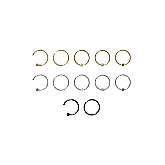 Multi-Pack CZ Goldtone Silvertone and Black Captive Rings Hoop Nose Rings and Half Hoop Nose Rings 12 Pack - 20 Gauge