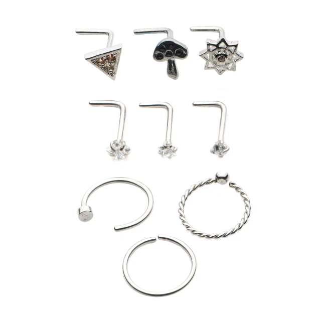 Multi-Pack CZ Mushroom Flower Hoop Nose Rings and L-Bend Nose Rings 9 Pack - 20 Gauge