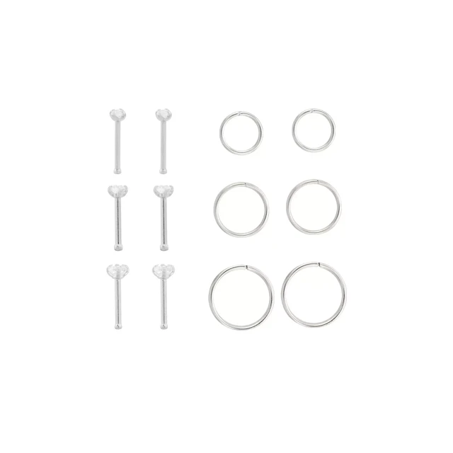 Multi-Pack CZ Silvertone Titanium Nose Pins and Hoop Nose Rings 12 Pack - 18 Gauge