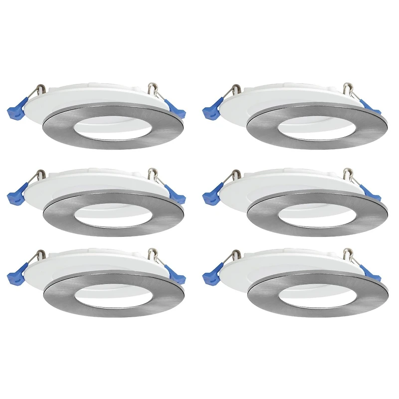 • 6-pack, 4" LED Slim Panel Light Kit - 450 Lumens, 6 Watts LED ( Equivalent to 50W Halogen), Saving 85% on your electricity bill • Additional Brushed Nickel trim included - customize your design with clip-on additional colorful trim more Color options available (sold separately): black, Antique brass, Copper, Chrome, Oil Rubbed Bronze • Cutting Hole: 3'' • Installs everywhere - INDOOR: Included in Showers (For Damp locations) and fits in tight spaces ( only requires 1 inch of Ceiling clearance), OUTDOOR: Included in soffits - (For Damp locations) • Dimmable - Our light Fixtures works perfectly with a wide range of dimmers allowing you to save energy and increase light bulb life span • ETL Approved for US and Canada / Energy Star