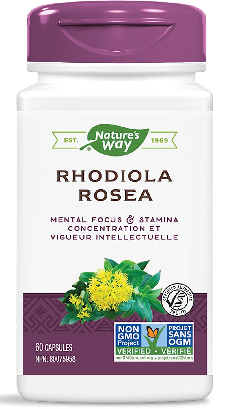 Supports Mental & Physical StaminaFights Stress & Boosts EnergyOffers Adrenal SupportStandardized To 2.5% WithanolidesDescriptionNatures Way - Rhodiola Rosea - 60 Veggie Capsules - NPN: 80075958 -- Nature's Way Rhodiola Rosea is used in herbal medicine to help support cognitive function such as mental focus and mental stamina. Nature's Way Rhodiola Rosea is Vegetarian, TRU-ID certified and non-GMO Project verified.Rhodiola Rosea Standardized Increases energy, physical endurance and well-being! Nature's Way Rhodiola Rosea extract is standardized to 3% rosavins and 1% salidroside which has been shown to produce the most beneficial results in clinical studies. Rhodiola, an adaptogen, comes from Arctic regions and has been shown to increase energy, physical endurance and well-beingINGREDIENTS