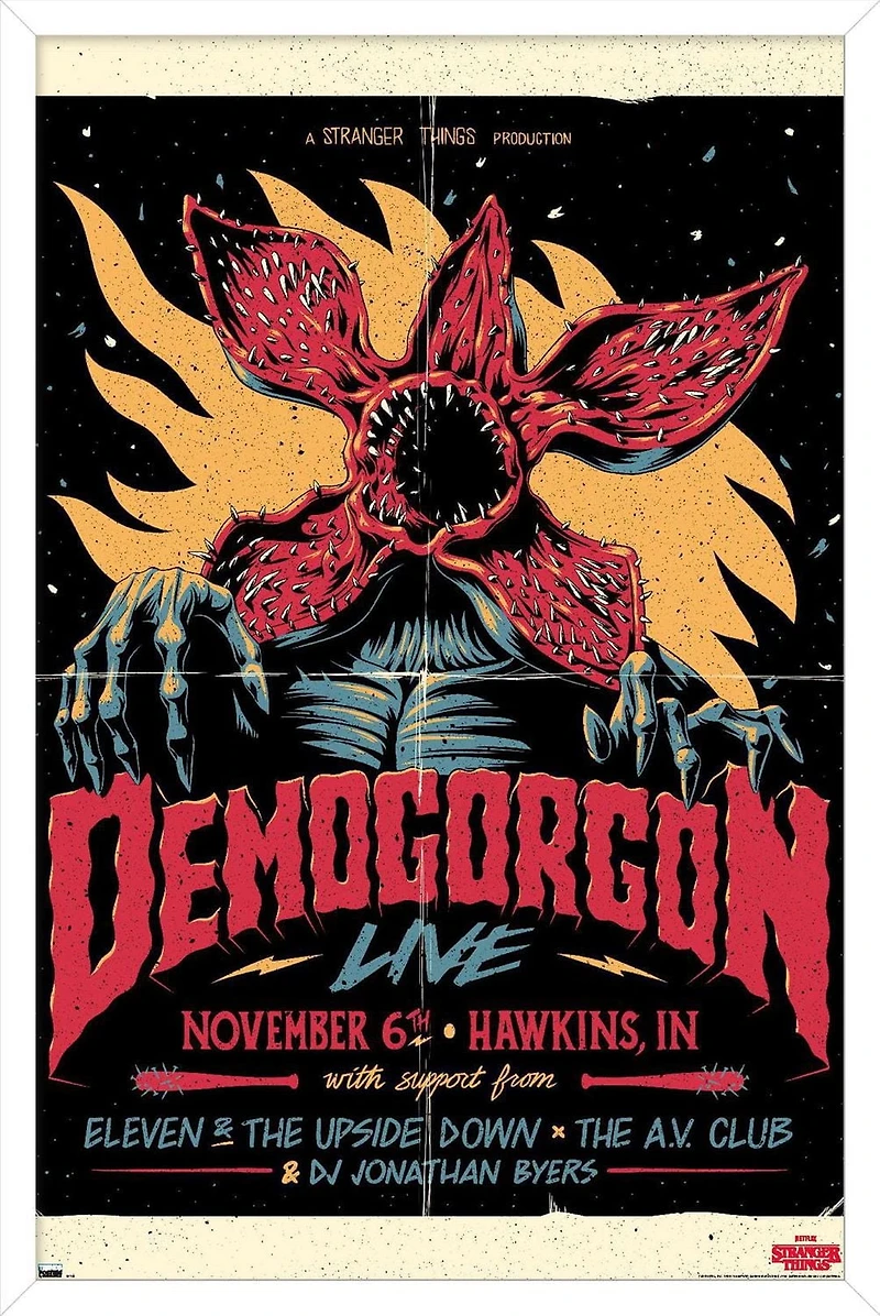 Trends International framed posters are everyone's favorite room decor! The clean, modern design and premium satin finish of this Netflix Stranger Things - Demogorgon Live Wall Poster will make a bold wall decor statement in any room. Decorate the bedroom, bathroom, kid's room, living room, office, dorm, and more! Our framed posters are lightweight and easy to hang using the sawtooth hanger so you'll be able to enjoy it in no time. Every one of our framed posters are proudly Made in the USA. Add these decorations alongside the other accessories on your party supplies list too! Trends International's wall posters are the perfect way to dress up your parties. A framed poster makes a great gift as well! Whether it's for a birthday, Christmas, house warming or for your best friend, they'll love receiving a framed poster to show off their style.