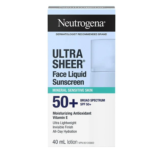 Neutrogena Ultra Sheer Face Liquid Mineral Sunscreen, Lightweight, Broad Spectrum SPF 50+ Facial Sunscreen for Sensitive Skin Leaves a Silky, Non-Greasy Finish, Oxybenzone-Free, 40 mL