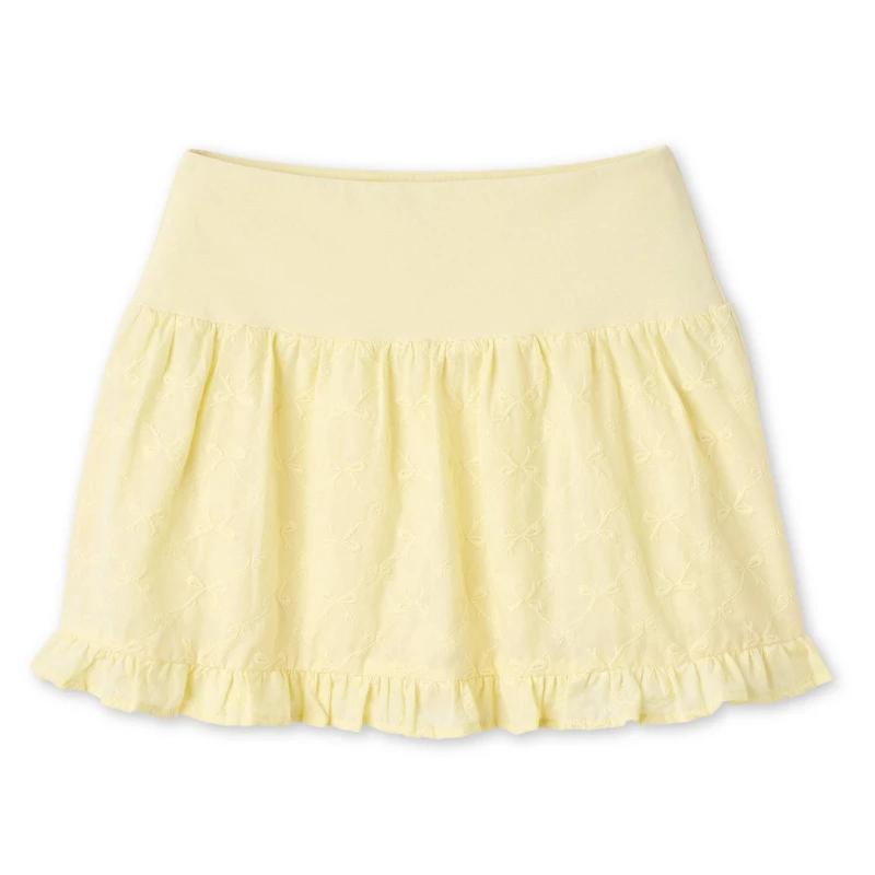 No Boundaries women’s bow embroidered skort adds a playful twist to an everyday essential. Made with stretchy inner shorts in soft jersey knit, it offers comfy coverage and easy movement throughout the day. The design features a wide elasticized waistband, all-over bow embroidery, and a ruffled hem that gives it a flirty finish. Pair it with cropped tees, tanks, or lightweight sweaters for effortless styling.This is a Junior Fit, we recommend sizing 1-2 sizes up from your regular size.