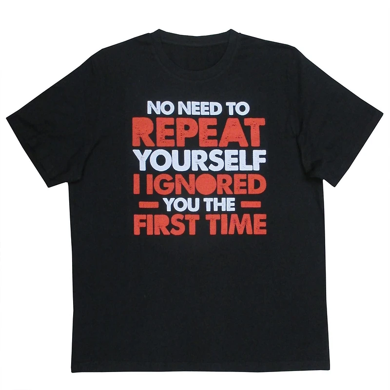 Men's short sleeve crew neck t-shirt with an officially licensed No Need to repeat yourself graphic. Made from soft, breathable,, 100% cotton, this stylish short sleeve t-shirt is perfect for any occasion! Proudly designed in Canada. Colour: BLACK.