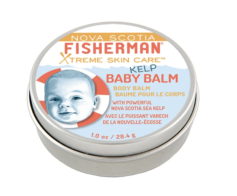 DescriptionNOVA SCOTIA FISHERMAN - Baby Kelp Balm - 28 gr - NPN: 00000000 -- Made with: Nova Scotia Kelp, Beeswax, Shea, Jojoba oil, Castor Oil, Olive Oil, Coconut Oil, Vitamin EScent: Soothing & Calming - Chamomile, Lavender, Lemongrass, Rose HipFormulated from our Rescue Balm formula, this all natural, all purpose Baby Balm will help sooth rashes, breakouts, cuts, scrapes, and any irritations. Fragrance is subtle, all natural, formulated to be soothing and calming.The largest organ of the human body, our skin, absorbs everything it comes into contact with. Water, sunlight, oxygen and the products we use. Our all-natural Rescue Balm is made with raw ingredients, nurtured by the sun and sourced as close to the Earth as possible. Safe on sensitive skin and all natural with no artificial ingredients.All Natural No Artificial Preservatives, Colours, or Fragrance Paraben free SLS free Gluten free No animal testing Made in NSINGREDIENTSOlea Europaea (Olive) Fruit Oil*, Butyrospermum Parkii (Shea) Butter*, Cera Alba*, Cocos Nucifera (Coconut) Oil*, Simmondsia Chinensis (Jojoba) Seed Oil*, Ricinus Communis (Castor) Seed Oil*, Rosa Canina Seed Oil*, Aloe Barbadensis Leaf Extract*, Tocopherol, Fucus Vesiculosus (Sea Kelp)*, Rosmarinus Officinalis (Rosemary) Flower Oil*, Melaleuca Alternifolia (Tea Tree) Leaf Oil, Lavandula Angustifolia (Lavender) Oil, Styrax Benzoin Gum, Pelargonium Graveolens Oil, Aroma, Chamomilla Recutita (Matricaria) Flower Oil*Certified Organic/Certie Bio