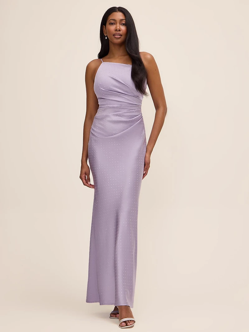 Elegant with a subtle edge, this lilac satin-like gown is designed with a softly draped one-shoulder silhouette that contours the body. Delicate stud embellishments catch the light across the fabric, adding a hint of sparkle to the smooth satin-like finish. The floor-length shape keeps the look refined and polished - an elevated choice for formal evenings, weddings, and special occasions. Note: Le Château dresses and Suzy Shier dresses differ in sizing. Please consult our size chart for more accurate measurements. Woven satin-like fabric One-shoulder Studded design Side pleats Side slit Back zipper closure HSP length: 61" Model is wearing XS Fabric: 100% polyester Lining: 100% polyester Hand wash in cold water
