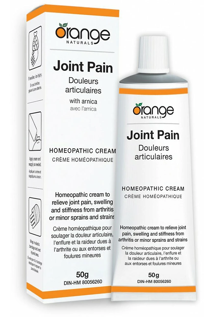 Helps relieve stiffness in muscles and tendonsHelps provide relief from sensations of tenderness, bruising and weakness in affected partsHelpful for pain that is worse with movement and motionHelps to relieve joint pain, swelling and stiffness from arthritis or minor sprains and strainsRelieves sensations of bruising and tenderness in areas sensitive to touchDescriptionORANGE NATURALS - Joint Pain Cream - 50 Gram(s) - NPN: 80056260 -- There is nothing worse than attempting those first few steps in the morning with aching joints or tender muscles. Even worse is making the effort to get up and walk when we have been sitting WAY too long. Arthritic or rheumatic joints or even muscles that have been fatigued from over-straining can be most unforgiving of our attempts to make them move. Orange Naturals Joint Pain cream with arnica will help to ease those feelings of stiffness, pain and weakness that can torment our spirits and challenge our joints, muscles or tendons with every move we make. Rub it in and move again with a smile.INGREDIENTS