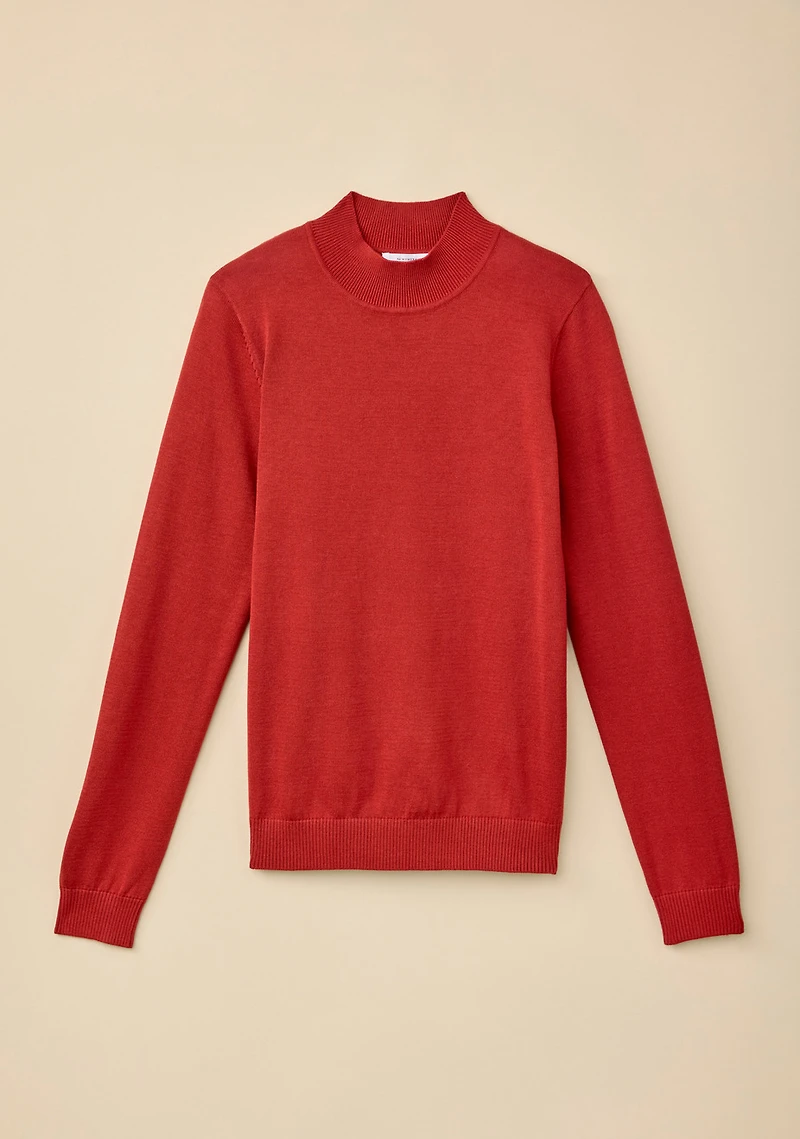 Soft organic cotton mock neck pullover with relaxed fit and ribbed trim. A conscious choice for casual fall comfort.