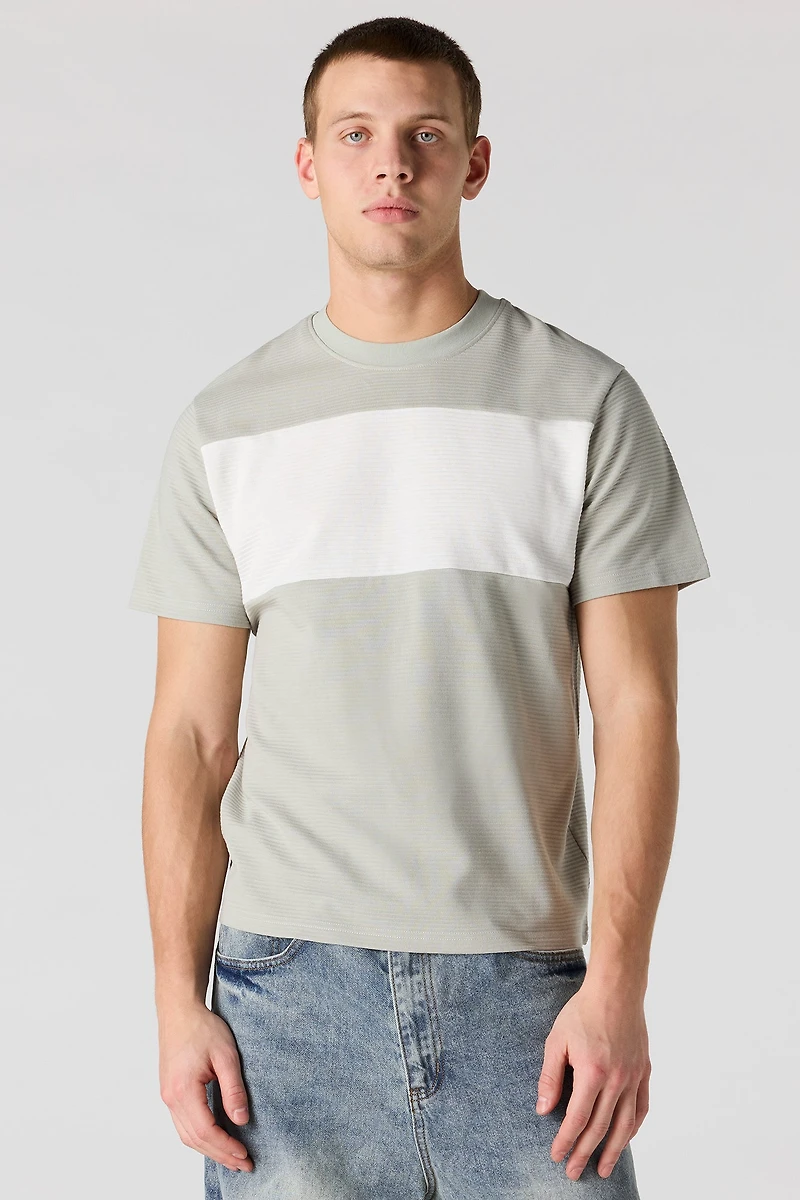 This top features ottoman material, colourblock print, crew neckline, and short sleeves.