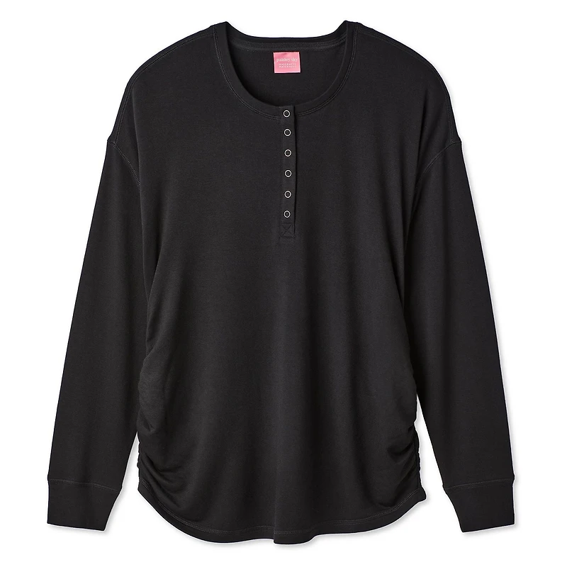 Meet your new maternity must-have: the Paisley Sky Maternity Long-Sleeve Lounge Henley. Made from brushed French terry with a soft, stretchy feel, this top offers all-day comfort whether you're at home or on the go. Design details include a classic crew neck, long sleeves, dropped shoulders, and elasticized side ruching that flatters your growing bump. The functional metal baby snap placket makes nursing simple and convenient. Pair it with our OTB Wide Leg Lounge Pants for the ultimate relaxed look.