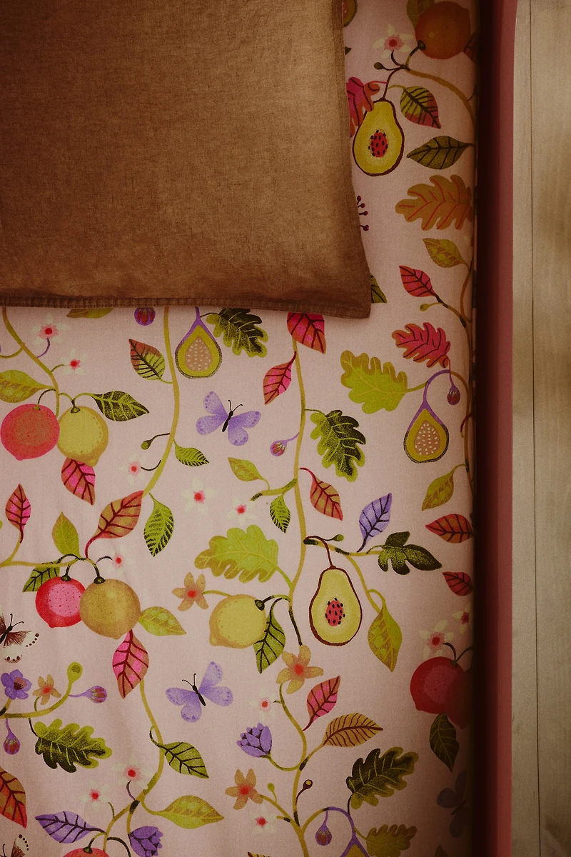 Fitted sheet in woven cotton fabric with a pattern. Easily matched with other colors and patterns for a personalized look. Fits mattresses up to 9 in. thick.