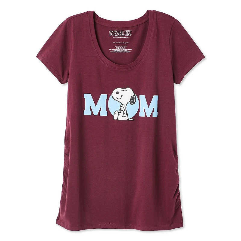 Bring some nostalgia to your maternity collection with the adorable styling of Peanuts women's maternity Snoopy ruched tee. Made with a cotton-rich blend, this tee is perfect for any casual outing or lounging at home. It’s designed with a round neckline, short sleeves, a cute front graphic print, and side ruching details to fit with your growing baby bump. This tee easily pairs with your maternity leggings or jeans for a complete look.
