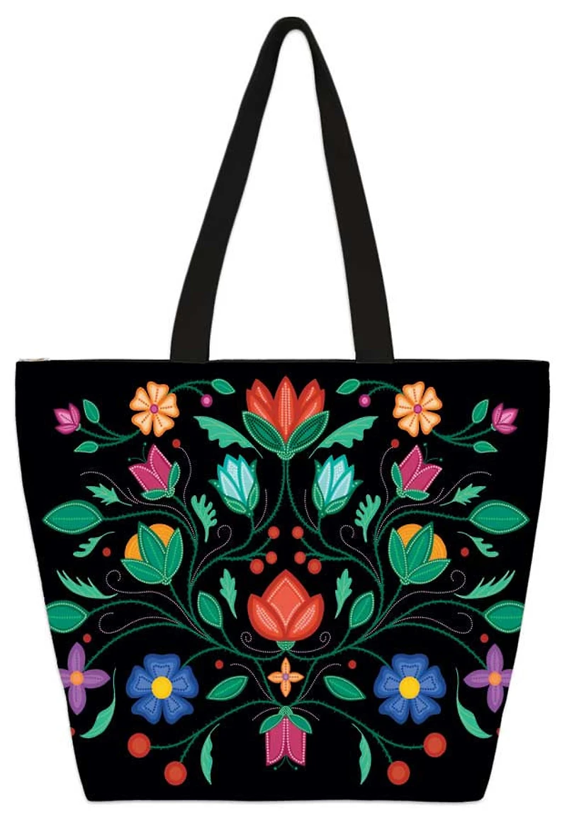 Petals of Ancestry Large Tote Bag by artist Lisa Berry - MétisOur Large Canvas Tote Bags are 20 x 15”, fully lined with an inside pocket, cotton handle, and zipper closure. Each tote features authentic Indigenous art. Ideal for everyday use, shopping, beach trips, or carrying books and essentials.