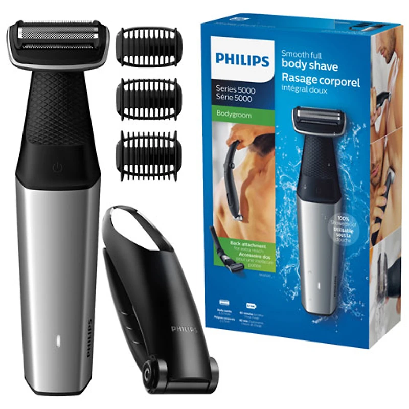 Versatile body groomer lets you tackle all areas of your body with one convenient tool Rounded trimming combs glide comfortably over your skin to trim thick hair with ease Shave head captures and cuts long and short hairs without causing knicks or cuts Extended-reach back attachment makes it easier to shave hard-to-reach areas on your back Self-sharpening blades stay sharp and ready, shave after shave Wet or dry operation lets you use it at the sink or in the shower Cordless design allows for better maneuverability, with up to 60 minutes of use on one charge