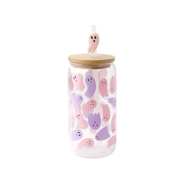 Pink and Purple Ghost Glass Cup with Straw and Topper - 16 oz.