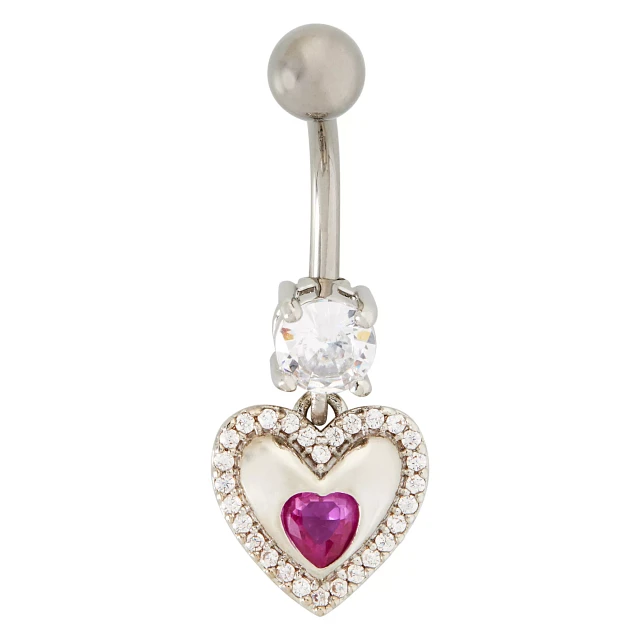 Pink CZ and Titanium Heart Dangle Belly Ring - 14 Gauge