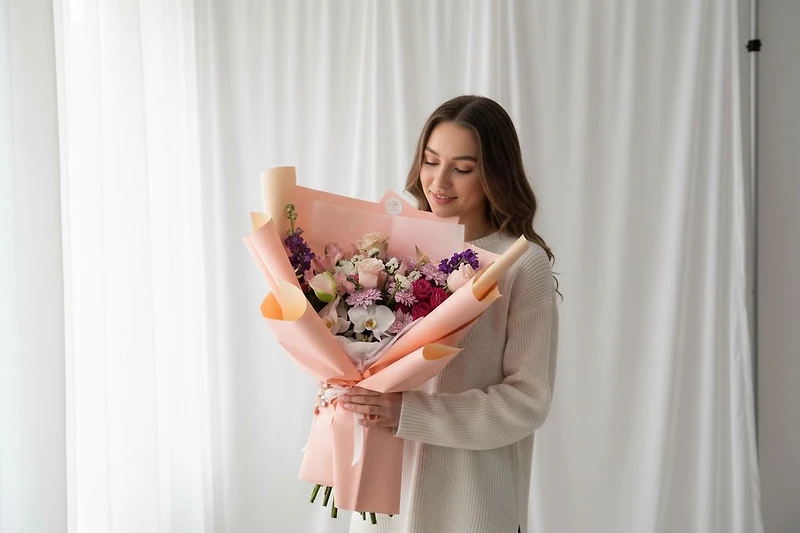 A stunning arrangement with a mix of fresh pink theme flowers in pink wrapping