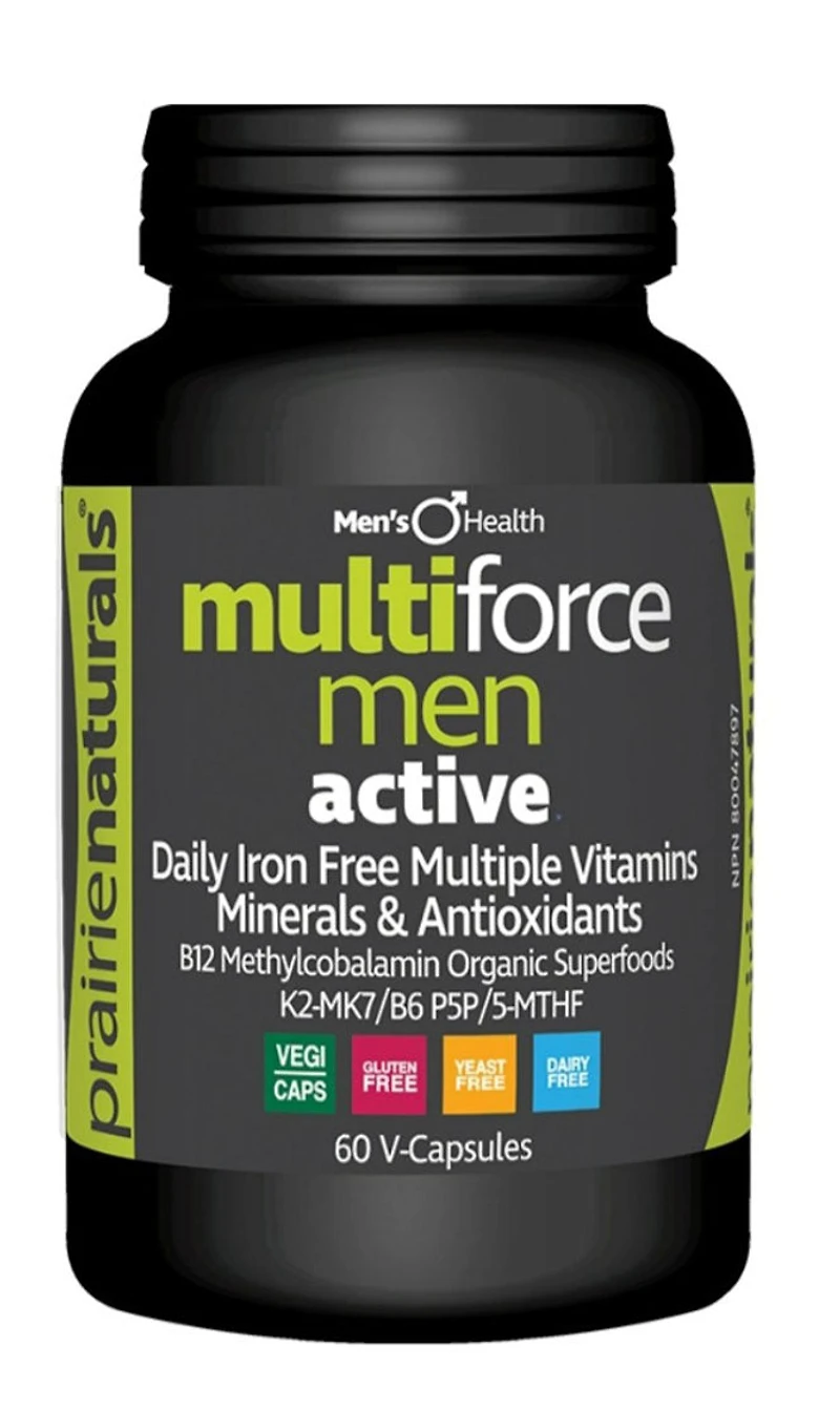 Multi-Force Men Active is ideal for men of all ages, men looking to improve their energy levels, men who need nutritional support to reduce symptoms of stress, anyone who already has optimal iron levels and active men.Men have specific health needs and concerns and often ignore health warnings. Unchecked this can lead to a serious deterioration in health and vitality. Even more concerning, men are at higher risk of developing disease and die at higher rates for all the top 10 causes of death including: heart disease, diabetes, liver disease and even cancer. The good news is that many of these hazards can be addressed with preventative lifestyle choices and health promoting daily habits. Prairie Naturals has been a pioneer in men’s health products since the early 1990’s.