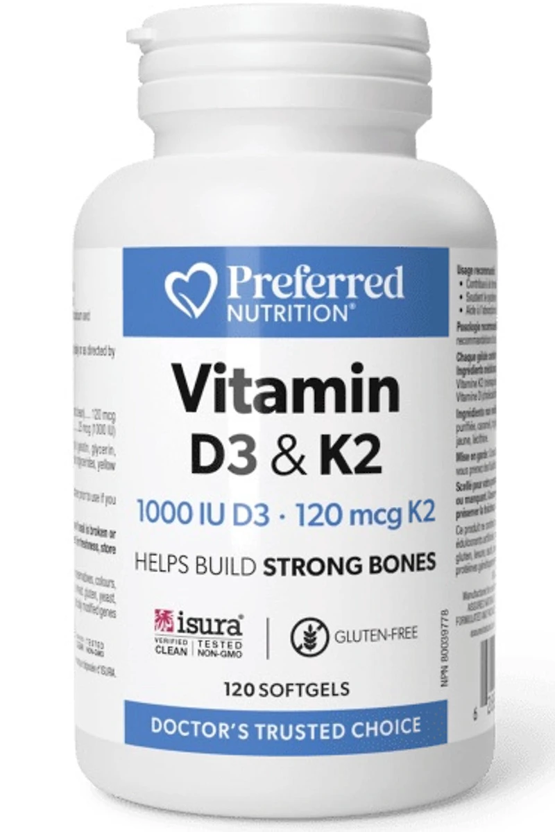 Preferred Nutrition Vitamin D3 & K2 combines the biologically active MK-7 form of vitamin K2 with active vitamin D3 (as cholecalciferol) to help build strong bones and teeth while supporting immune function. Each daily softgel provides 120 mcg of vitamin K2 derived naturally from natto beans, along with 1000 IU of vitamin D3.
