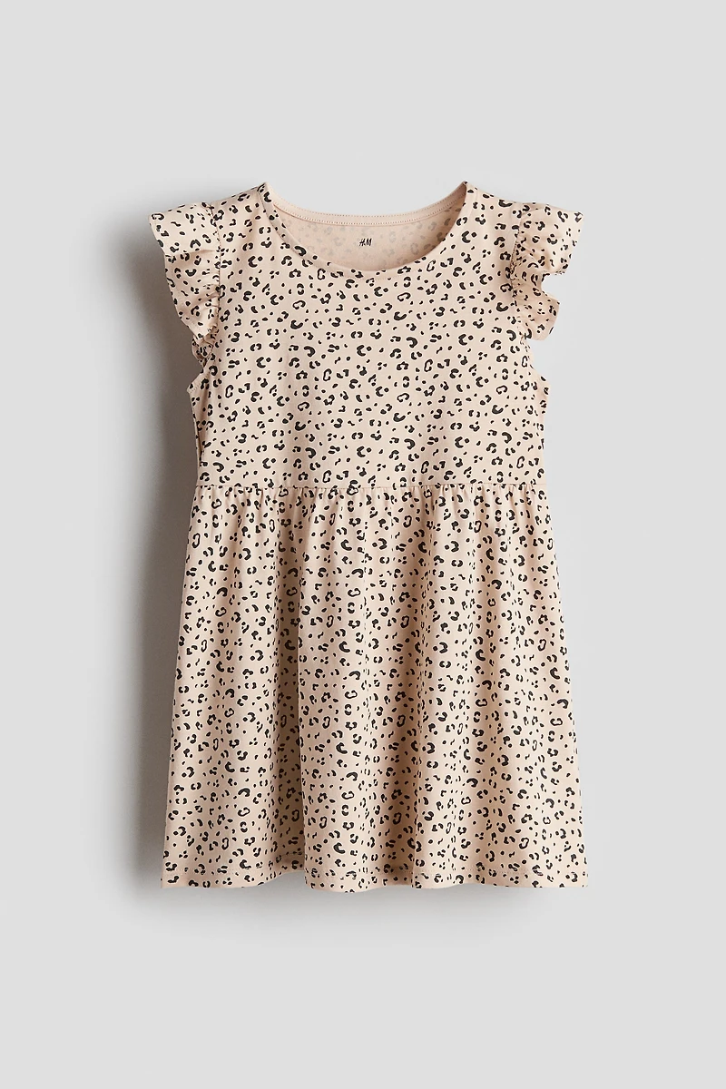 Sleeveless dress in soft cotton jersey. Round neckline, ruffle-trimmed arm opening, and a gathered seam at midsection.