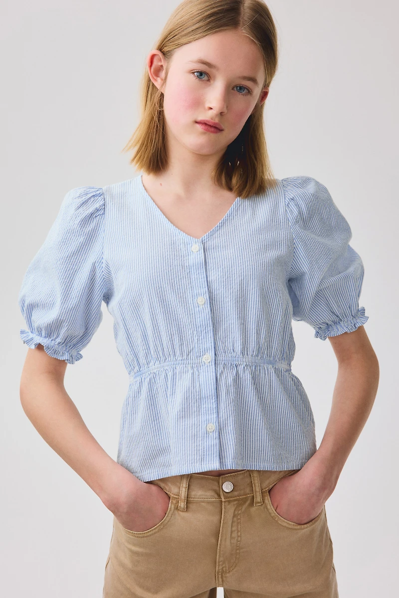 Blouse in airy cotton seersucker. V-neck, buttons at front, and narrow elastic at midsection. Short puff sleeves with elasticized, ruffle-trimmed cuffs.