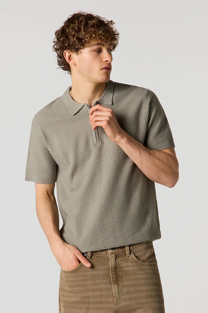 This top features knit material, quarter zip-up, flat collar, and short sleeves.