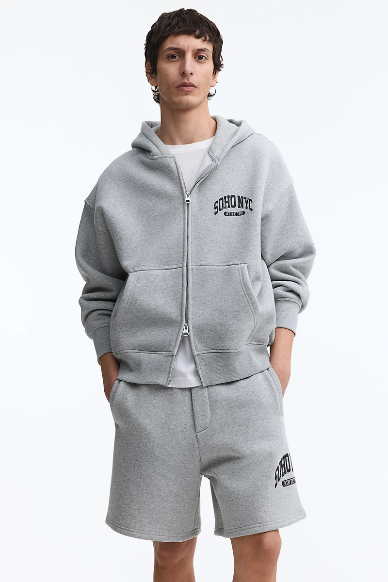 Relaxed-fit sweatshorts in heavyweight cotton-blend fabric with a soft, brushed inside. Casual but not oversized silhouette. Concealed drawstring and covered elastic at waistband, welt side pockets, and a patch back pocket.