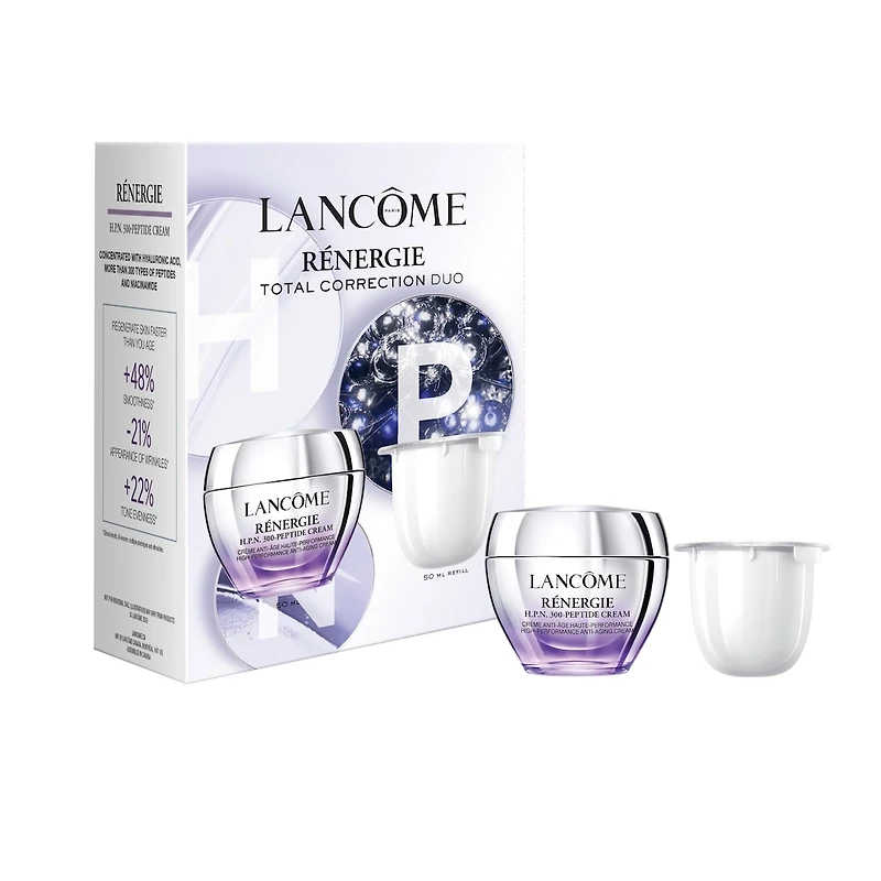 This gift set, valued at $315, includes a Refill for Rénergie H.P.N. 300-Peptide Cream (50 mL) and a Rénergie H.P.N. 300-Peptide Cream - Refillable (50 mL). Discover the new era of Lancôme high-performance anti-aging inspired by regenerative skin sciences, concentrating hyaluronic acid, over 300 peptides, and Niacinamide in one unique cream.