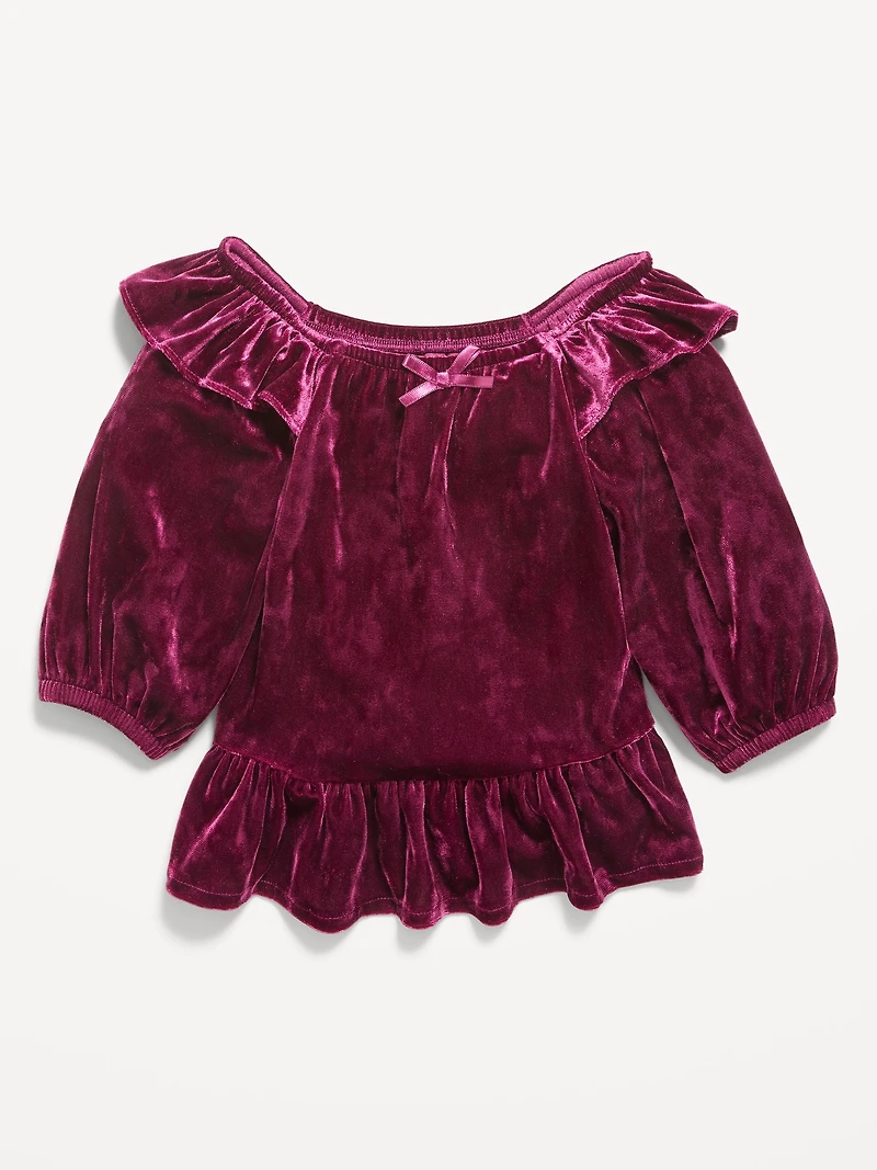 square neck elbow length puffy sleeves ruffled shoulders and hem slightly fitted hits at waistmachine wash according to the care instruction label .