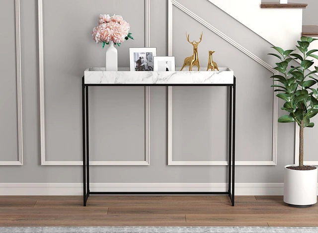 Safdie & Co. Console Table, White Marble Tray Top & Black Metal Legs.