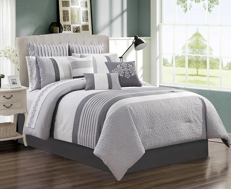 Add comfort to your lifestyle with this luxury premium comforter set. It is a nice inclusion for any home. This bedding set will fit perfectly in any room. It is made of 100% premium polyester microfiber, which makes it soft and provides you with exceptional comfort while you rest. This superior quilt set will easily blend with most decor and set styles. Its unique details give you a subtle style and touch of elegance. This bedding set is made from premium quality fabric and has the remarkable style that adds exceptional value to each ensemble.Features:1 Comforter 104X92, 2 Pillow Sham 20X36, 1 Bedskirt 78X80+14, 1 Square Cushion 16X16, 1 Square Cushion 18X18, 1 Boudoir Pillow 12X18