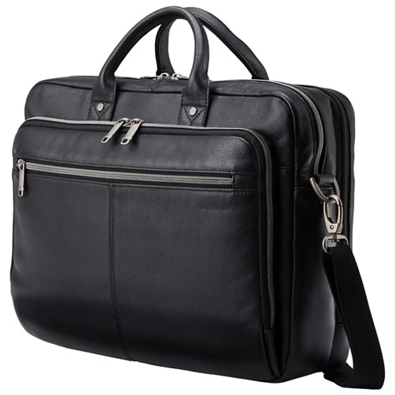 Part of the Samsonite Classic Leather collection Laptop messenger bag is ideal for carrying your laptop (up to 15.6") and other daily office essentials Three large padded pockets provide a safe space for accessories, gadgets, and other sensitive items Large front pocket with a tablet pocket, 2 phone pockets, and pen pockets offer plenty of options for organisation Back compartment with divider provides convenient space for file folders Large back zip pocket offers easily accessible storage space for smaller items Top bail handles and removable shoulder strap with non-slip shoulder pad offer 2 different options for convenient carrying SmartSleeve on back panel allows the bag to fit over a luggage carry-handle to make travel easy Constructed of original top-grain leather for a premium and durable look