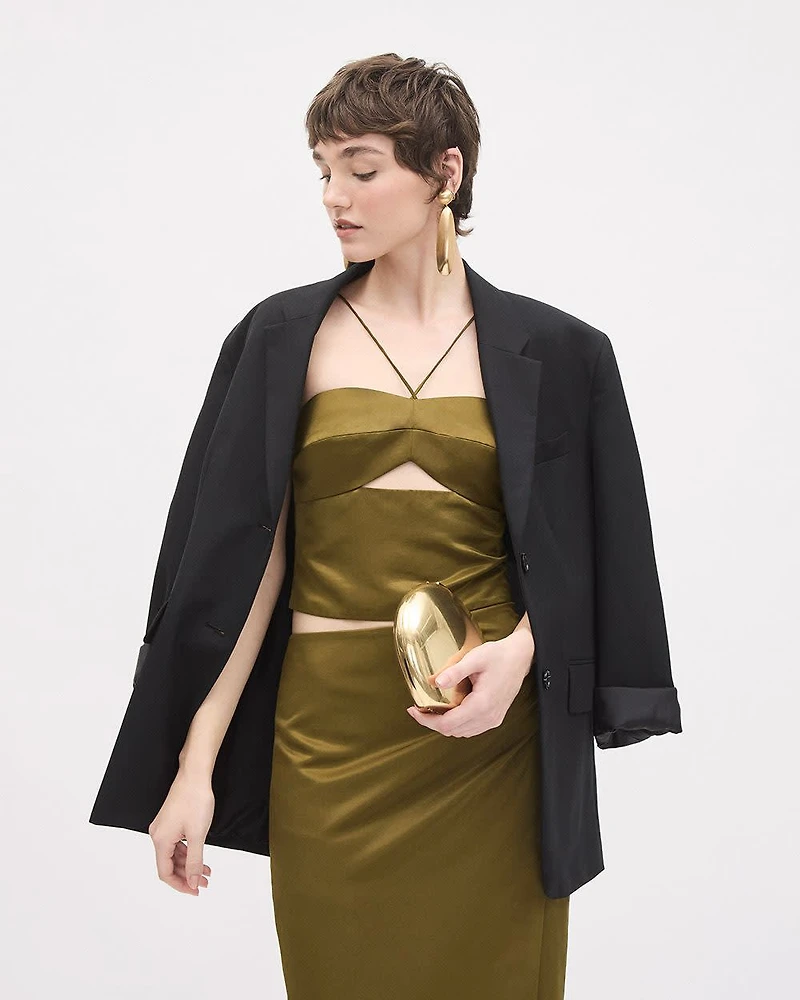 This beautiful satin blouse featuring a smocked back and thin straps to tie in the back is the perfect piece to elevate your evening style.
