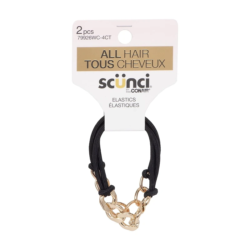 Scunci accessories are there to get you from workout to workplace to a night out on the town. From everyday scrunchies and no-damage hair elastics to glam clips, and hair wraps, Scunci has the perfect accessories for fitness fanatics & style mavens. Hair ties never looked so good! Classic black rope ponytailers paired with trendy gold chain detailing, these accessories perfectly compliment any ponytail, bun, or updo.