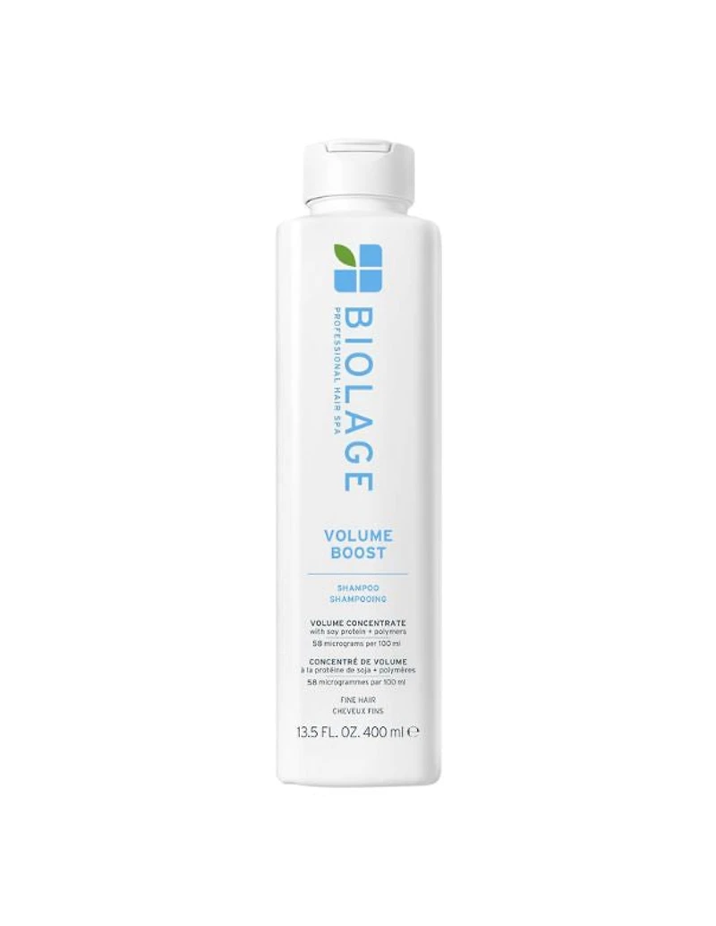 Le shampooing Volume Boost aux protéines de soja et aux polymères augmente le volume des cheveux fins.