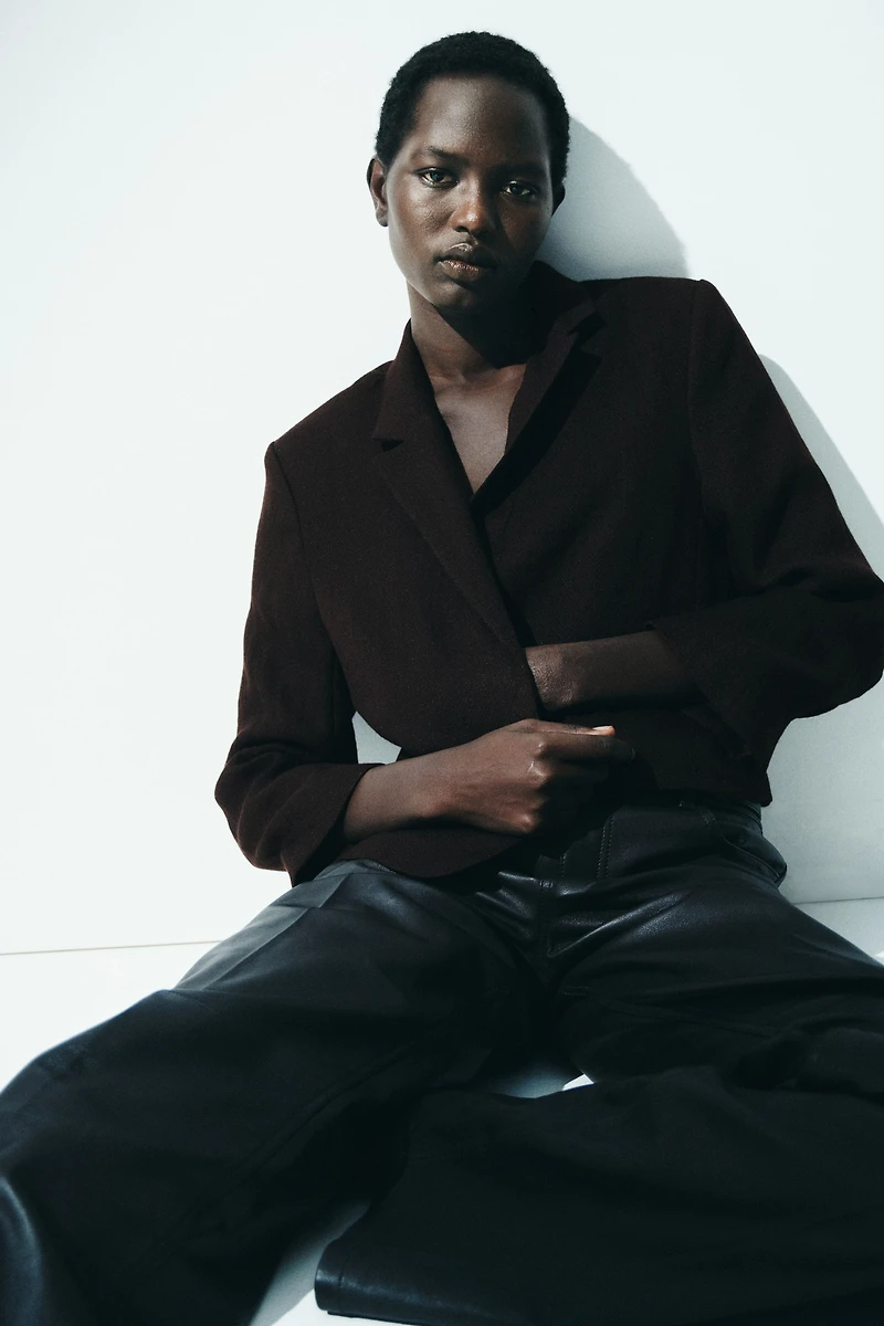 Short blazer in woven fabric. Notched lapels, shoulder pads, and long sleeves with a slit at cuffs. No fasteners. Lined.