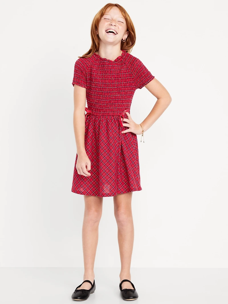 Short-Sleeve Fit and Flare Smocked Bow Dress for Girls