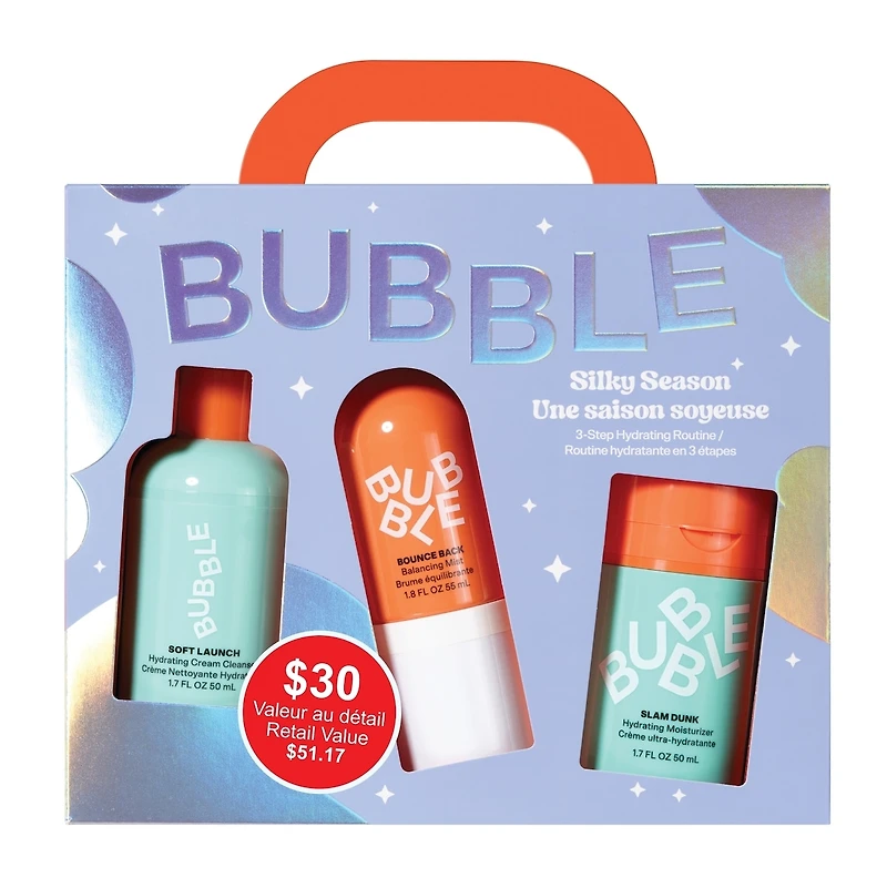 Serve up softness with Bubble’s SILKY SEASON 3-Step Hydrating Routine. Gently cleanse with Soft Launch, refresh and reset with Bounce Back, then nourish dry skin with Slam Dunk’s rich, creamy hydration.