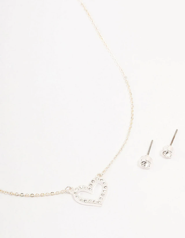 Open Diamante Heart Silver Necklace & Stud Earrings Set
