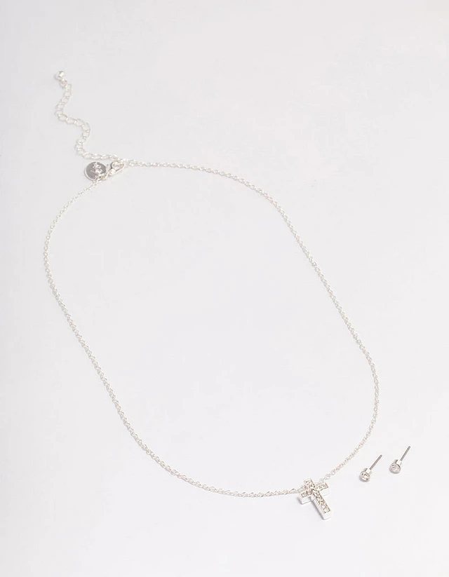 Silver Plated Diamante Cross Necklace & Huggie Earrings Jewellery Set