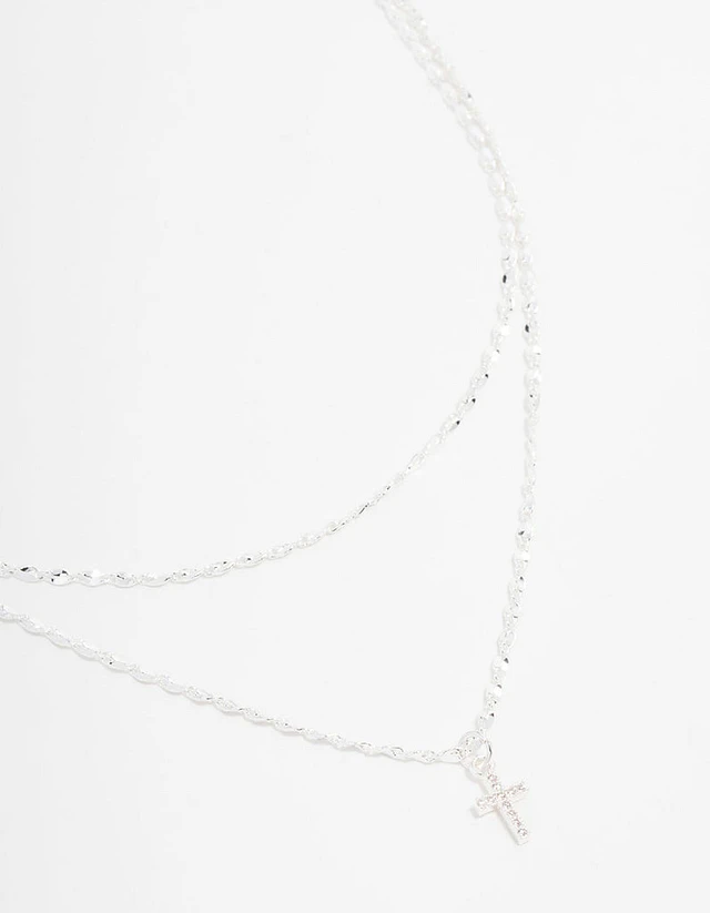 Silver Plated Cubic Zirconia & Plain Cross Layered Necklace