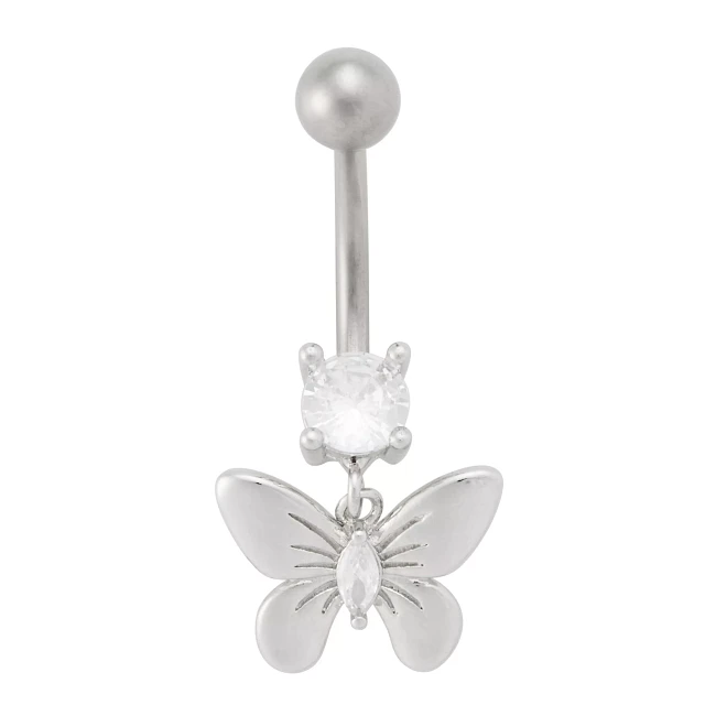 Silver Titanium CZ Butterfly Dangle Belly Ring - 14 Gauge