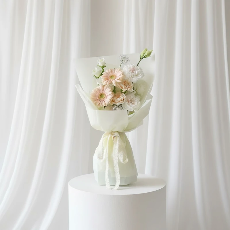 A stunning bouquet of a 7 white and peach theme wrapped in a white or beige colour wrapping Please order at least 3 days in advance for exact flower selection, and note that substitutes may be used for the same value due to flower availability. Please note that substitutes may be used in the same value due to flower availability.