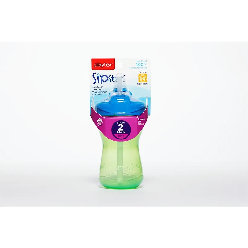 - Let’s give baby a hand with the ergonomic design of these Stage 2 cups. The contoured design will help your baby grip the cup easier, while the various drinking features, including Spout, Straw and Spoutless, will accommodate your little ones’ needs. For ages 9 months and older, 9 oz size, unique spill-proof valve eliminates messes and is easy to clean. Available in Spout, Straw and Spoutless varieties to accommodate every child’s needs BPA Free, all parts are top rack dishwasher safe, or can be hand washed Leak-Proof Guarantee*Playtex Sipsters cups are leak-proof, spill-proof and break-proof guaranteed!*