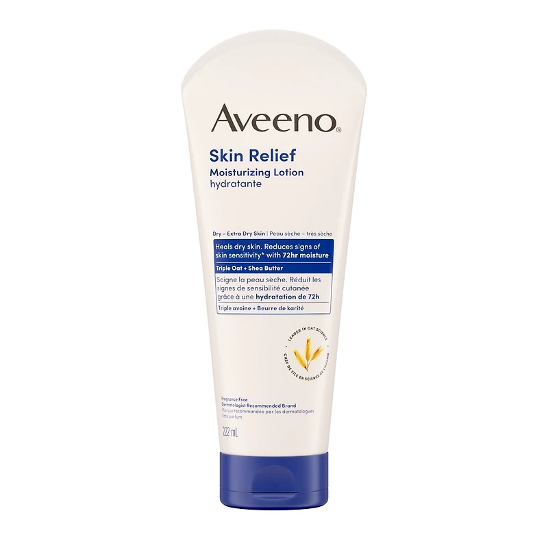 - • Moisturize sensitive skin for 48 hours with Aveeno Skin Relief Moisturizing Lotion. The moisturizing lotion helps heal and relieve very dry skin. This product comes with one 222-millilitre tube of fragrance free body lotion. This tube is made with 40% Post-Consumer Recycled Plastic. • Clinically proven to help soothe itchy, dry skin for a full 48 hours, the lotion helps provide all-day moisture to sensitive skin. This nourishing daily body lotion is fragrance free for use on sensitive skin. • Specially formulated with Triple Oat, shea butter, and dimethicone skin protectant, this moisturizing lotion is clinically proven to help relieve and soothe itchy, dry skin and moisturize skin for a full 48 hours. • Provides soothing relief for itchy, dry skin and locks in long-lasting moisture. The creamy moisture lotion has a rich formula that can be used as part of your daily skincare routine. • From a dermatologist recommended brand, fragrance free Aveeno Skin Relief Moisturizing Lotion is paraben free, dye free, non-greasy, non-comedogenic, has non-GMO oats, allergy tested, and can be used on sensitive skin.