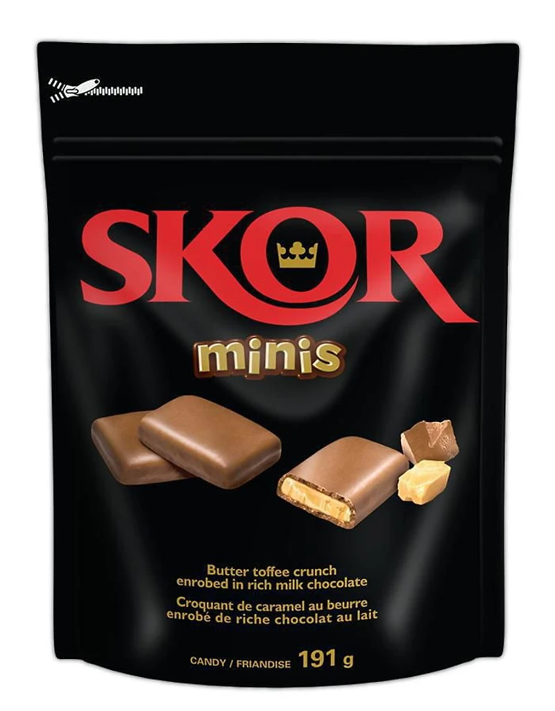 SKOR Minis feature rich butter toffee enrobed with delicious milk chocolate to create a distinctively rich treat. Decadent by themselves, SKOR Minis are also great in recipes or crushed over ice cream and desserts.