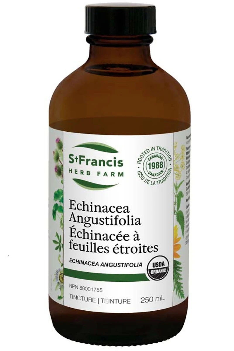 St Francis Herb Farm - Echinacea Angustifolia - 250 Millilitre(s) - NPN : 80001755Combat your colds, flu, and infections with our Echinacea Angustifolia Tincture.• Antimicrobial infection fighter• Shortens duration of colds and flu• Supportive therapy in managing both upper respiratory and urinary infections• Noteworthy for streptococcal infectionsWho it’s for:Take our Echinacea Angustifolia Tincture if you’re fighting a cold or flu or for prevention if you’re trying to fend off frequently occurring colds or flu.DIRECTIONS & USEAdults & adolescents (14 & over): 1.5-4 mL (45-120 drops); Adolescents (10-13 years): 0.8-2 mL (22-60 drops); Children (5-9 years): 0.4-1 mL (12-30 drops); Children (2-4 years): 0.3-0.6 mL (9-18 drops). All doses should be taken 3 times daily in a little water on an empty stomach.CAUTIONS & NOTESConsult a health care practitioner before use: if you have a progressive systemic disease such as tuberculosis, collagenosis, multiple sclerosis, AIDS and/or HIV infection; if you have an autoimmune disorder; if you are taking medications to suppress the immune system (immunosuppressants). Consult a health care practitioner if symptoms worsen or persist.INGREDIENTSCertified Organic Echinacea (Echinacea angustifolia, root and rhizome)Non-Medicinal Ingredients:Distilled water, certified organic alcohol