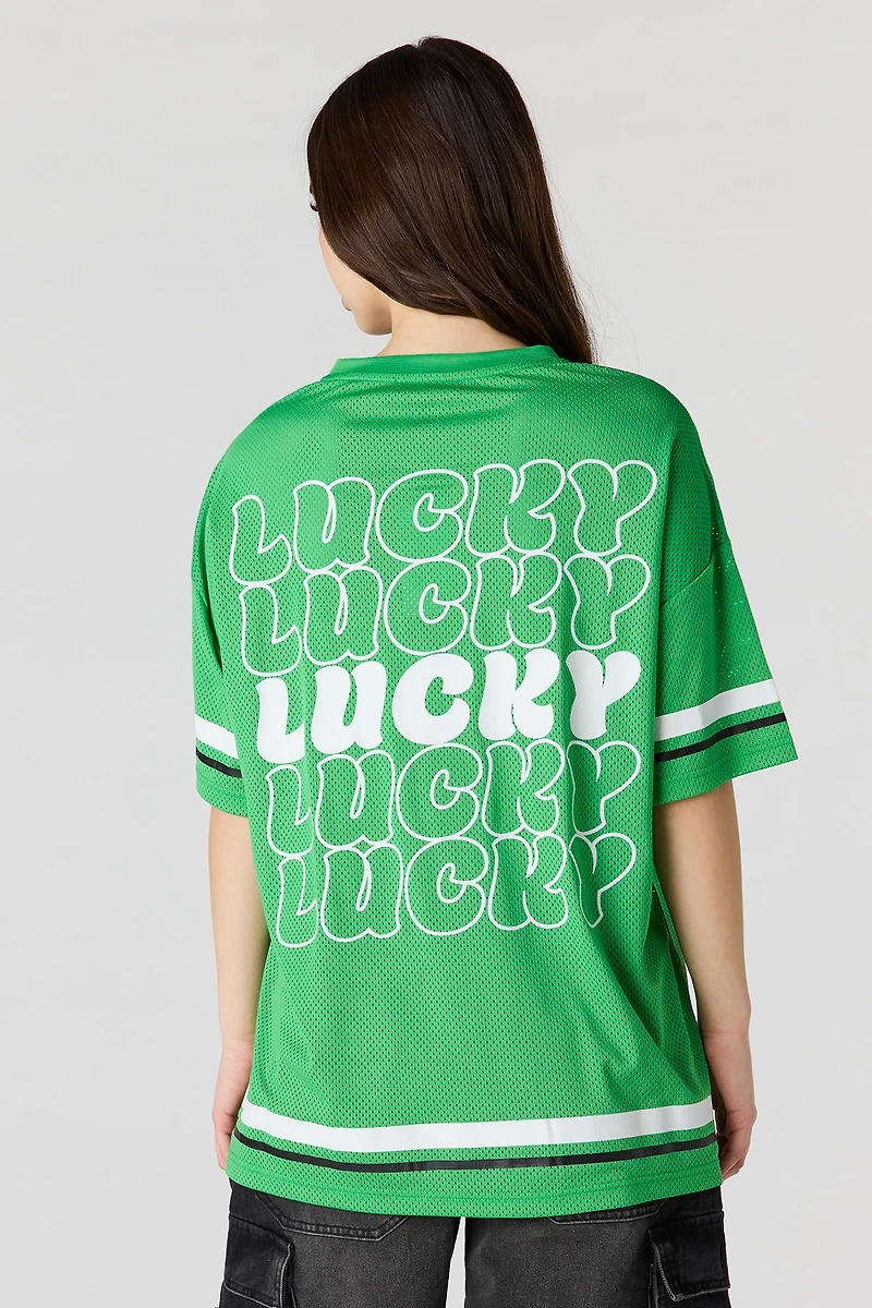 This jersey features mesh material, graphic front and back, v-neckline, short sleeves, striped trim and relaxed fit.