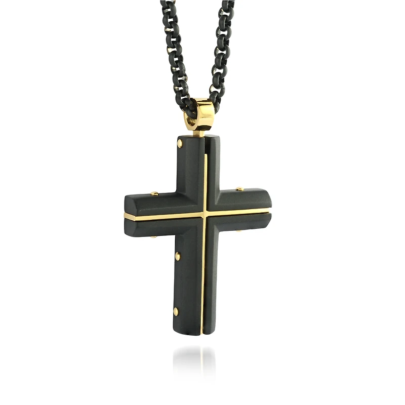 This striking necklace combines the bold contrast of matte black and gold accents, with a sleek stainless steel cross pendant at its center. The matte finish adds a modern edge, while the gold highlights offer a touch of warmth and sophistication. Perfect for those seeking a contemporary, meaningful piece that balances strength and style.